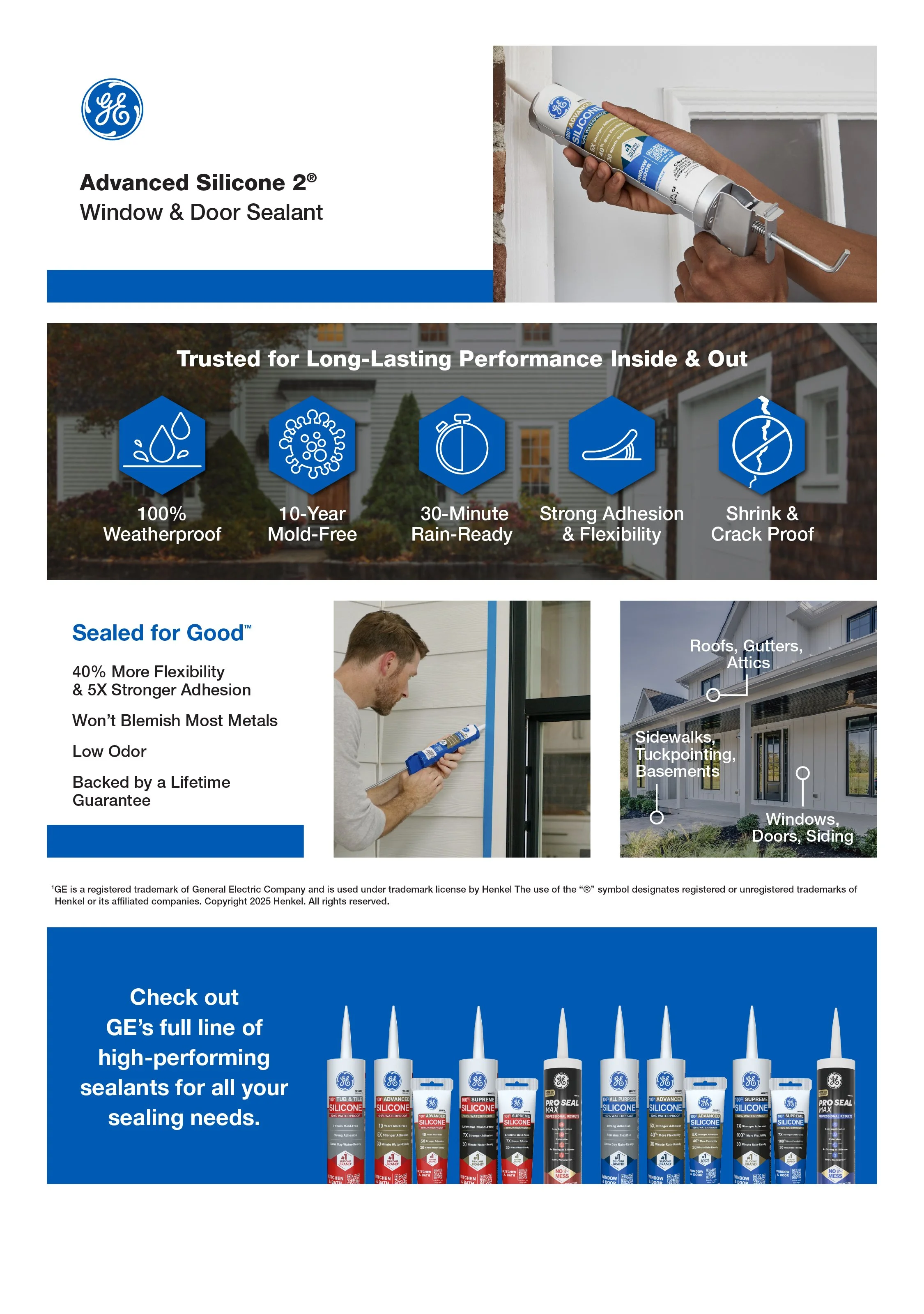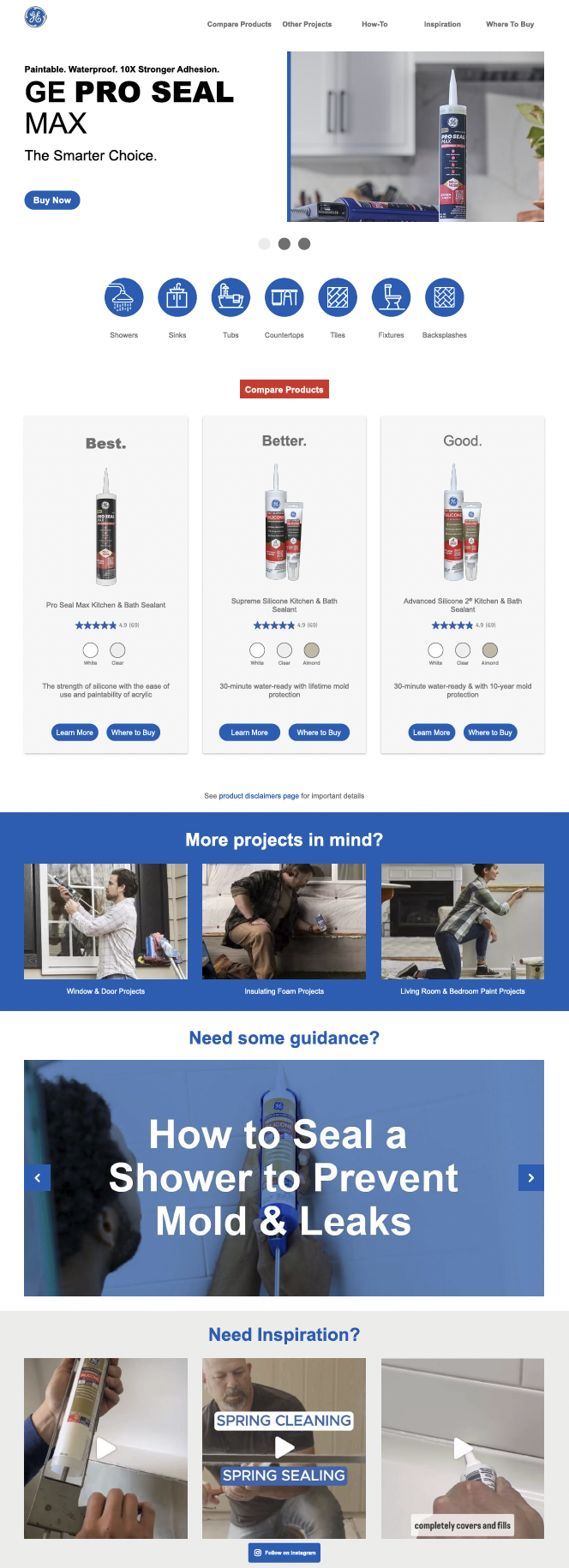 Landing page design and updates for GE's consumer-facing web presence structured to guide customers to the right product for their project while reinforcing the brand's authority in the sealants category.