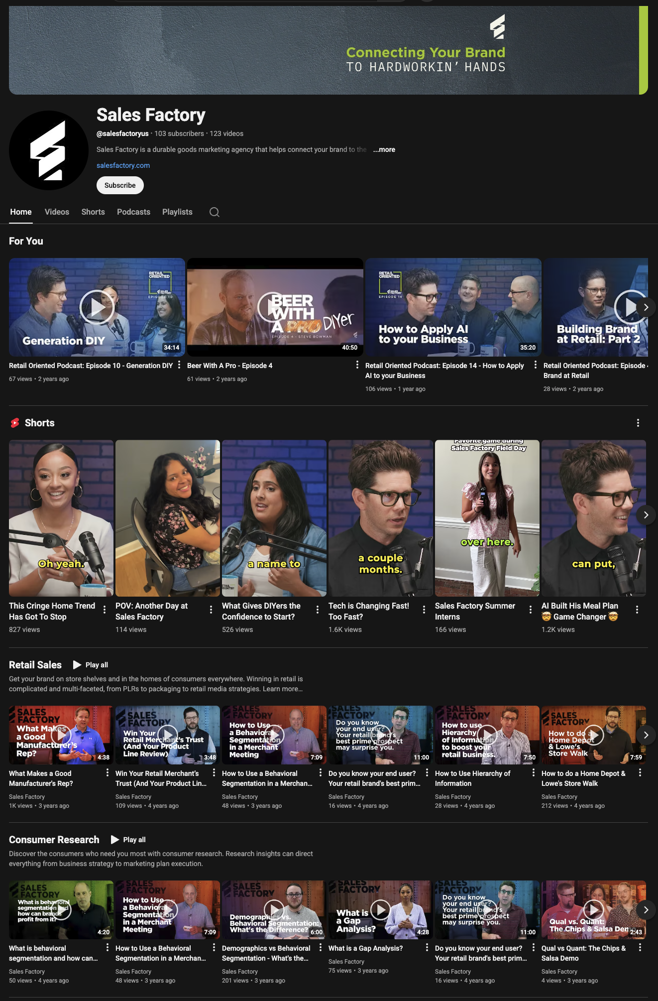 Sales Factory's YouTube channel is where the agency puts its own expertise on camera — thought leadership, retail insights, case studies, and brand content for an industry audience. I handle all the visual production work behind it: motion graphics, lower thirds, title cards, thumbnail design, and the accompanying social graphics that extend each video's reach across platforms. Beyond the screen work I'm involved in art direction and set design for shoots — making sure what's on camera looks as considered as everything around it.