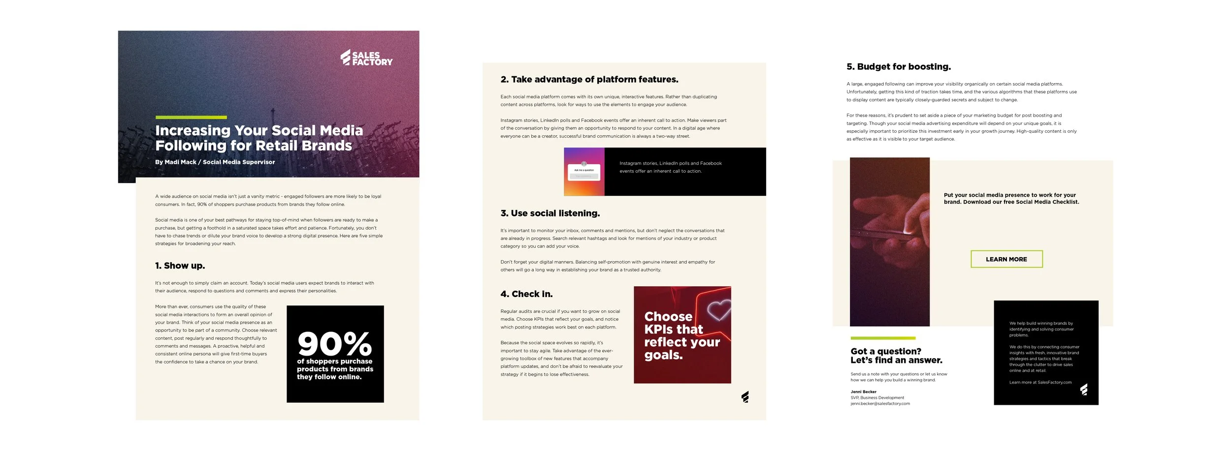 Sales Factory needed internal and external creative that felt as sharp as the work it produces for clients. Content that communicates the agency's expertise in retail marketing, consumer research, and brand strategy and that holds up in a feed full of other agencies doing the same thing.